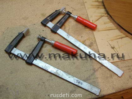Для того, чтобы удобно было выпиливать лобзиком или пилить ножовкой, деталь лучше всего закрепить с помощью струбцины. Знакомтесь! Это третья рука мастера.