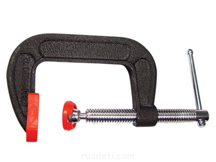 С их помощью легко закрепить деталь к столу или сжать вместе несколько деталей. Для этого нужно свести чёрные губки и закрутить красную ручку с винтом. Очень удобно! И стоят струбцины дёшево.