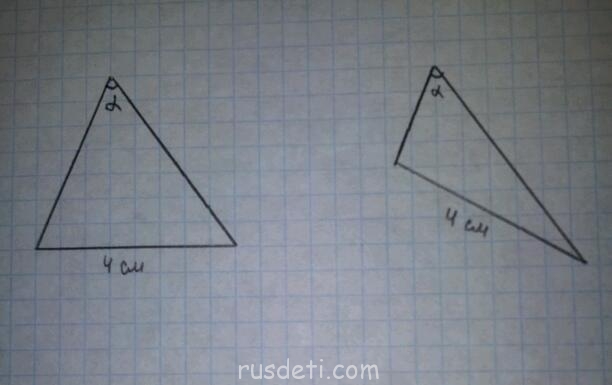 СергейСт, я тут подумала про ваш четвертый признак и поняла, что он не совсем верный. Противолежащая сторона может лежать по-разному, и треугольники будут неравны. Например, на рисунке углы у треугольников равны, противоречащие стороны тоже, но треугольники неравны