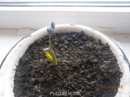 Моя младшенькая дочка выкопала в палисаднике подснежник и пересадила его в миску, чтоб занести домой. Уже распускается!