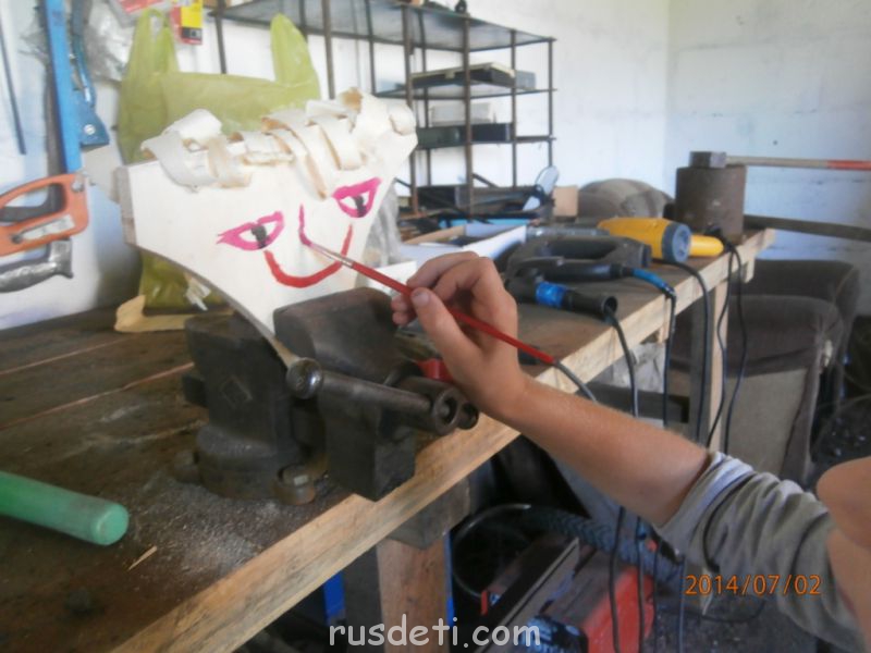 Семилетняя Алёна взяла обрезок фанеры у меня в мастерской, приклеила стружки, как положено Буратино, и стала его рисовать.