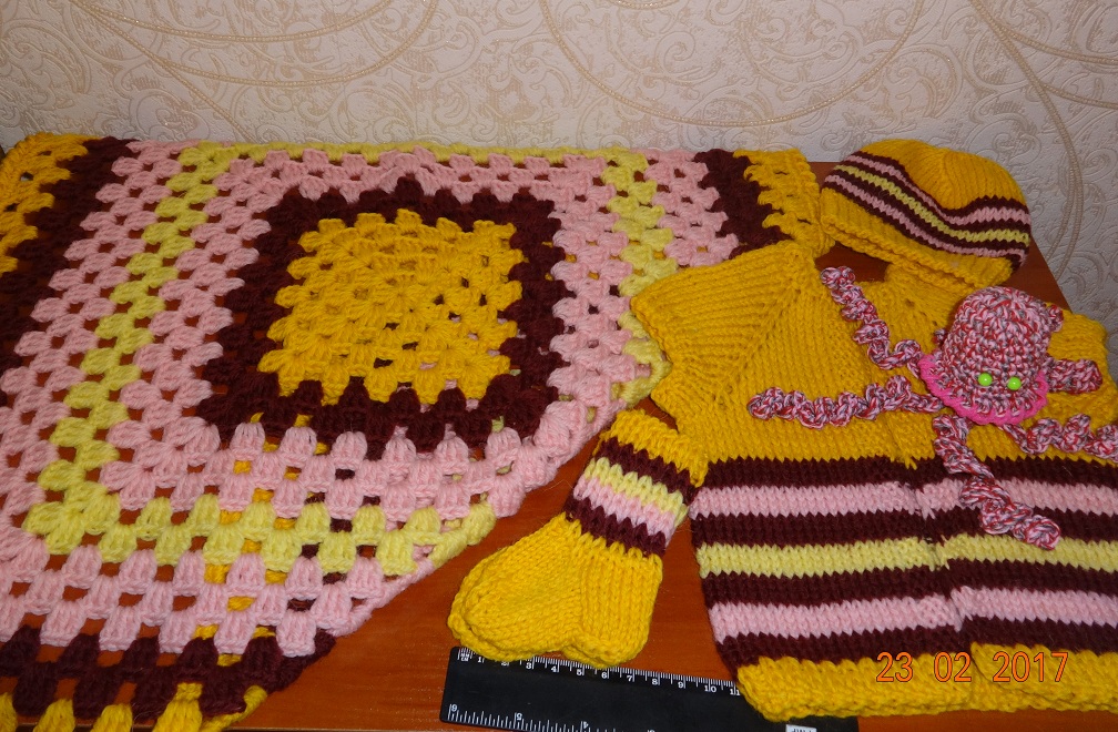 Такими комплектами одежды ( жилетка, шапочка, носочки и пледик) и "игрушкой" рукодельницы в 15 городах Казахстана помогают выживать малышам.