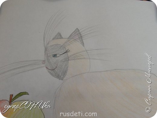 Первый рисунок у меня такой натюрморт: Ваза с цветком, яблоко и (самое главное) киска.