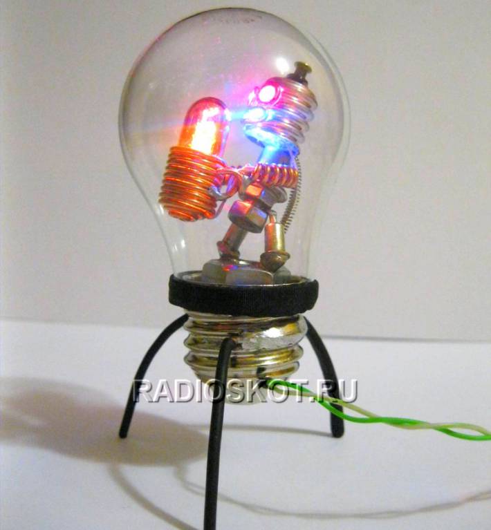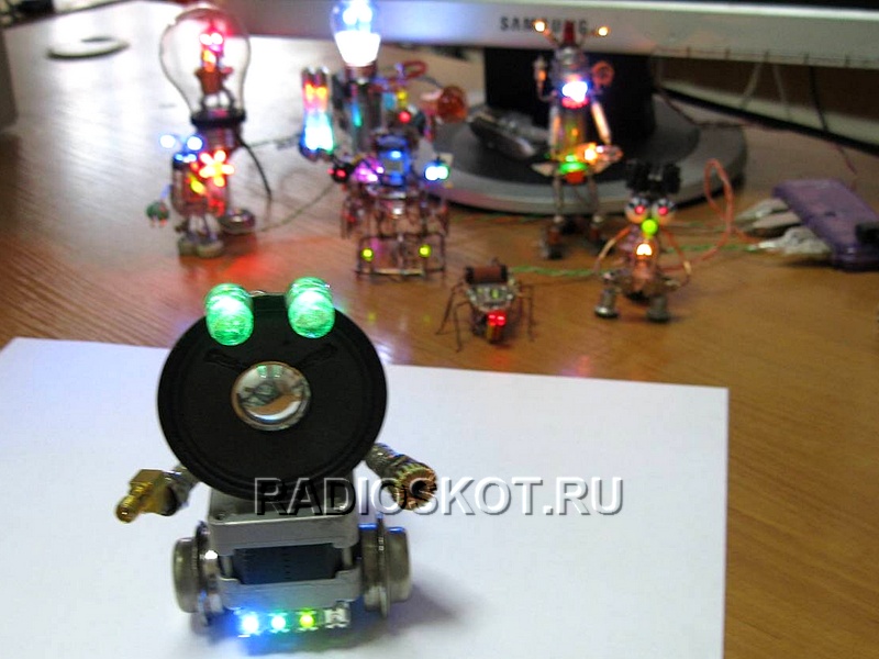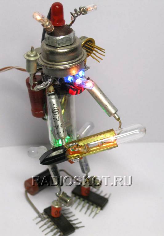 У каждого радиолюбителя и не только, дома скопилось немало различных импортных и советских радиодеталей - резисторов, конденсаторов, радиоламп и других компонентов. Многие из них нерабочие, многие морально устарели за давностью лет. Но не спешите их выкидывать - из них можно собрать интересные поделки, которые станут достойным украшением вашего стола или даже серванта в гостинной. Особенно эффектно получается, если оснастить эти фигурки различными светодиодными индикаторами синих, красных, зелёных и других цветов. В общем смотрите