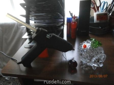 Переходим к инструменту, который очень может сгодиться в детском творчестве как мальчишкам, так и девчонкам. Это клей-пистолет. В него вставляется стержень из пластмассы, внутри разогревается, и когда он размягчится, мы давим на красную клавишу (на "спусковой крючок" ) и выдавливаем жидкий пластик в место склейки. Пластик очень быстро застывает! Пол-минуты и всё!