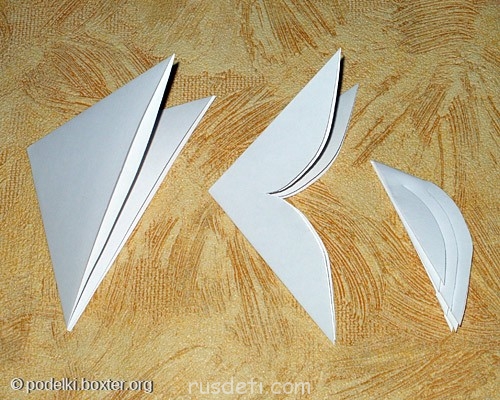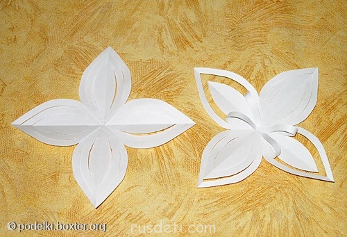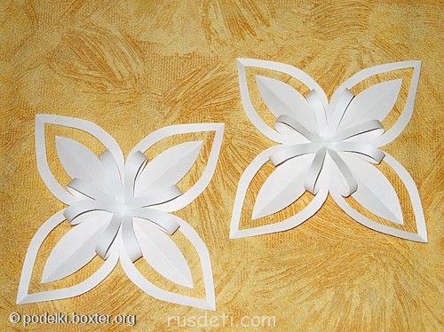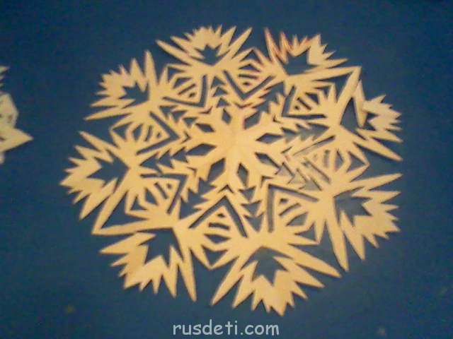 Делается она быстро Берем два одинаковых квадратных листика бумаги (для ксерокса или из детских наборов )-из них будем делать две детали одной снежинки.Каждый листик складываем с угла на угол дважды. Дальнейшие действия хорошо видны на фото.
