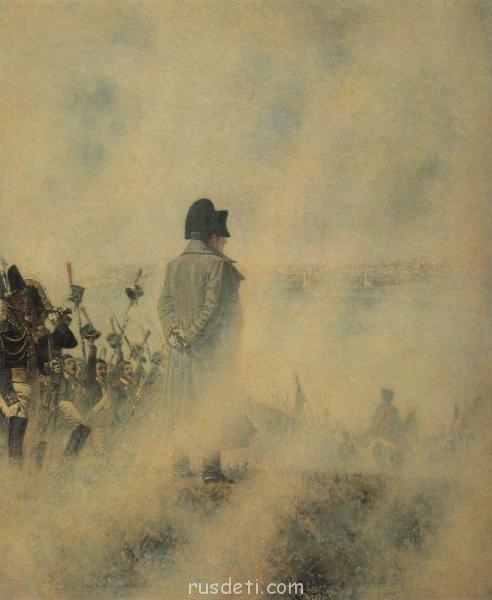 «Над голубым Неманом плыл дым от костров. Передовые части громадной армии ждали сигнала к переправе. Все зависело от маленькой фигурки в треугольной шляпе и сером сюртуке, которая тяжело сидела на белом коне. Эта фигурка на холме видна была издали. От нее ждали знака идти на русскую сторону.