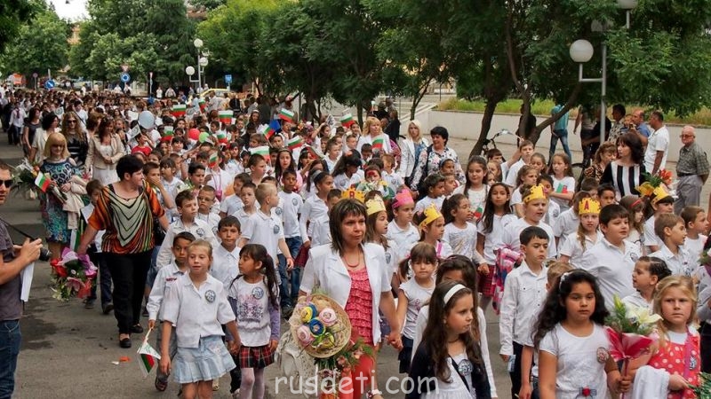 Дети выходят на улицы города и идут к памятнику этим святым. Поделюсь с вами фотографиями, на которых ученики моей подруги. И второе фото - шествие по улице города в честь праздника святых Кирилла и Мефодия.